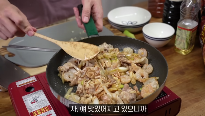 팬을 중불로 예열한 후 대파 한 대를 큼직하게 썰어 넣고, 이어서 대패삼겹살 1인분을 함께 넣어 볶아줍니다. 이때 대파에서 향긋한 향이 올라오고, 삼겹살에서 기름이 살짝 배어나오도록 볶아주는 것이 핵심 포인트입니다. 고기가 너무 익기 전에 불을 약하게 줄여 향이 충분히 배도록 해주세요.