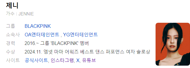 2023년 HBO 드라마 "다 아이돌"에 특별출연하며 연기자로서도 가능성을 보여준 제니는 과거 예능 "미추리"와 최근 "아파트 404"에 고정 출연하며 대중과의 친근한 소통을 이어가고 있습니다.