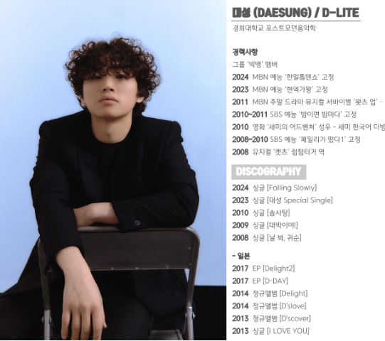 대성은 YG엔터테인먼트 소속으로 2006년 빅뱅 멤버로 데뷔하여, 대표 아이돌로 자리 잡았습니다. 빅뱅의 인기는 국내외를 막론하고 엄청났으며, 수많은 히트곡을 남겼습니다. 2022년 대성은 YG엔터테인먼트를 떠나 알앤디컴퍼니로 소속사를 옮겼으며, 현재 빅뱅 멤버로는 지드래곤, 태양, 탑과 함께 활동 중입니다.