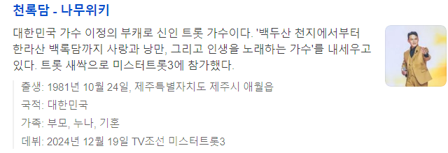 천록담은 트로트 오디션 프로그램 ‘미스터트롯3’에 출연하여 새로운 음악적 도전을 선보였다. 첫 무대부터 특유의 허스키한 보이스와 감성적인 가창력으로 강렬한 인상을 남겼으며, 심사위원들과 대중의 이목을 집중시켰다.
