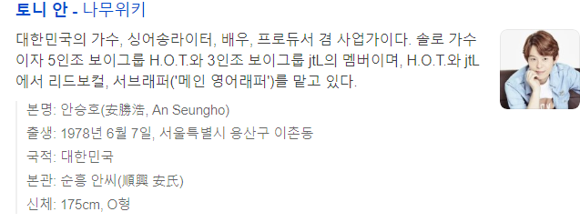 본명은 안승호이며, 1978년 6월 7일 서울특별시 용산구 이촌동에서 태어났다. 영어 이름은 Tony An으로, 미국에서는 Anthony An이라는 이름으로 불리기도 했다. H.O.T.의 멤버로서 1996년 데뷔한 후, jtL을 거쳐 솔로 가수로서도 꾸준한 활동을 이어갔다. 또한, 프로듀서와 사업가로서도 활약하며 다양한 방면에서 영향력을 발휘했다.
