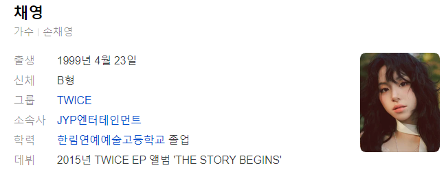 채영의 본명은 손채영이며, 1999년 4월 23일 서울특별시 강동구에서 태어났습니다. 대한민국 국적을 가지고 있으며 키는 159cm, 혈액형은 B형입니다. 학창 시절부터 예술에 큰 관심을 보였던 그녀는 결국 한림연예예술고등학교 실용음악과에 진학해 본격적으로 음악적 재능을 키워 나갔습니다.