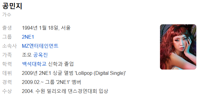 | 가수 '2ne1' 산다라박 프로필 / 나이 / 키 / 국적 / 몸무게 / 노래 / 성격 / 가족 / 동생 천둥 (0) | 2025.01.24 |