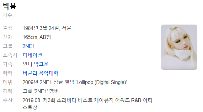 | 가수 '2ne1' 산다라박 프로필 / 나이 / 키 / 국적 / 몸무게 / 노래 / 성격 / 가족 / 동생 천둥 (0) | 2025.01.24 |