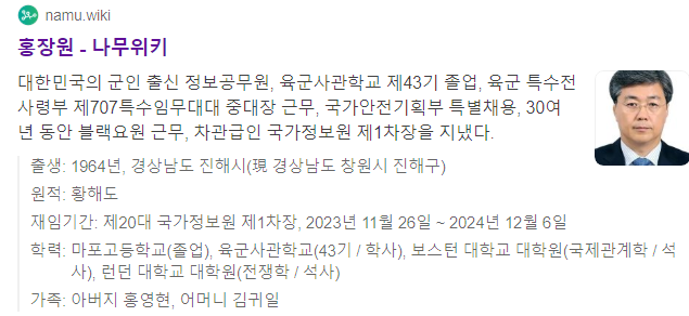 국정원 차장 홍장원 프로필