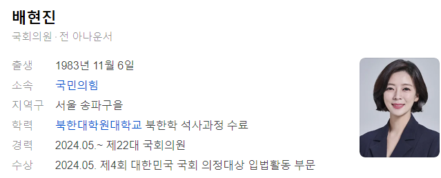 배현진은 언론인 출신의 정치인으로, 국민의힘 소속 국회의원으로 활동하며 정치와 사회 발전에 기여하고 있습니다. 그녀는 다양한 수상 경력을 통해 정치적 역량을 인정받았으며, 대중적인 인지도와 정치적 영향력을 동시에 갖춘 인물로 주목받고 있습니다.
