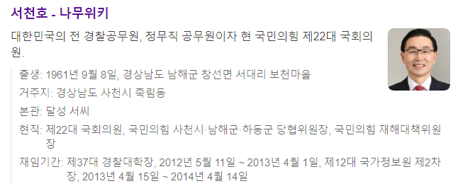 서천호는 경찰, 국정원, 국회를 거치며 대한민국의 정치 무대에서 다양한 역할을 수행해왔다. 그의 경력은 강한 리더십과 정책적 기여가 돋보이는 한편, 논란과 의혹으로 얼룩져 있기도 하다. 현재 국회의원으로서 활동을 이어가고 있는 그가 향후 어떤 행보를 보일지 주목된다.