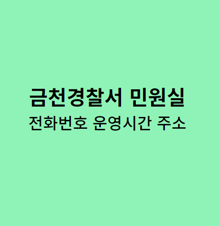 금천경찰서 민원실은 평일 오전 9시부터 오후 6시까지 운영됩니다. 주말(토·일) 및 공휴일은 운영되지 않으므로 방문 시 참고하시기 바랍니다.