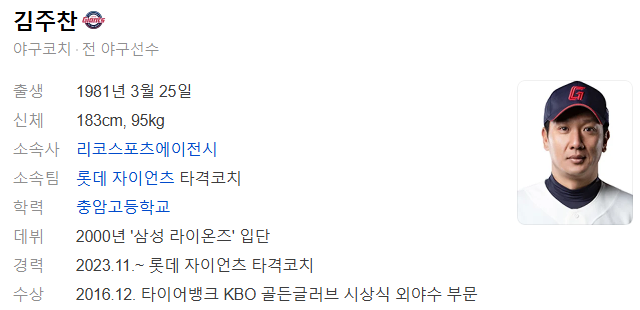 김주찬 코치는 기아 타이거즈에서 선수 생활을 마치고 두산 베어스와 롯데 자이언츠에서 코치로 활동하며 경력을 쌓았습니다.