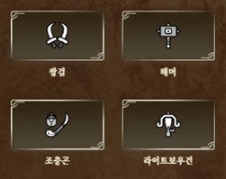 | 쌍검 | 빠른 연속 공격과 높은 회피 능력이 특징입니다. 완벽한 회피에 성공할 경우 추가적인 공격 강화 효과를 얻을 수 있습니다. |