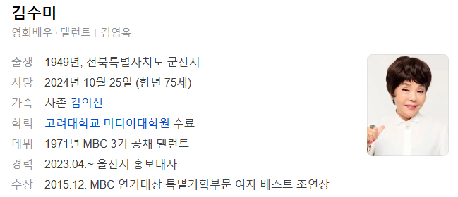 김수미 씨는 2024년 10월 25일, 지속적인 건강 악화와 피로 누적으로 인해 가톨릭대학교 서울성모병원에서 심정지로 별세하셨습니다.