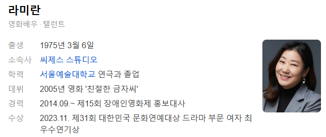 2005년 영화 '친절한 금자씨'로 데뷔한 이후 다수의 영화와 드라마에서 인상적인 연기를 선보이며 대중들에게 큰 사랑을 받고 있습니다. 라미란은 키 160cm에 몸무게 60kg, MBTI 유형은 ENTP로 알려져 있습니다.
