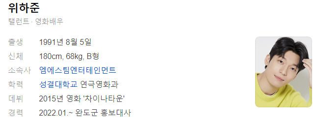 배우 위하준은 1991년 8월 5일 전라남도 완도군 소안면에서 태어났습니다. 본명은 위현이며, 키는 180cm, 몸무게는 68kg입니다. 혈액형은 B형이며, 성결대학교 연극영화학부에 연극을 전공으로 휴학 중입니다.