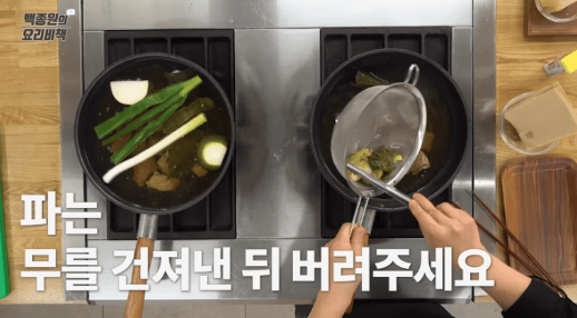 큰 냄비에 물 2L를 붓고 데친 갈비, 통으로 자른 무, 대파, 다시마를 넣고 센 불에서 끓입니다. 물이 끓기 시작하면 중불로 줄여 1시간 30분 정도 천천히 우려냅니다. 중간에 나머지 물 2L를 추가해 주면 더욱 깊고 진한 육수를 얻을 수 있습니다. 이 과정에서 다시마는 끓기 시작한 후 10분 이내에 건져내야 쓴맛이 나지 않습니다.