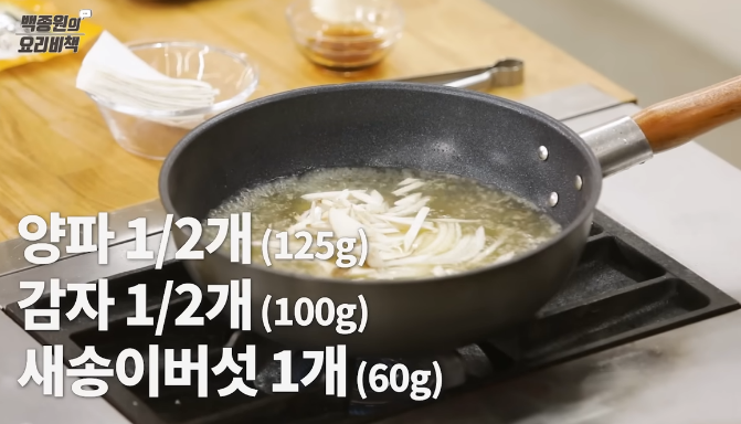 육수가 끓으면 액젓과 소금을 넣어 간을 맞추고, 채 썬 감자와 느타리버섯을 추가하여 중불로 줄여 천천히 끓입니다. 다진 마늘과 어슷 썬 대파도 넣어 풍미를 한층 높여줍니다.
