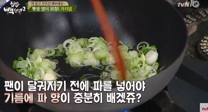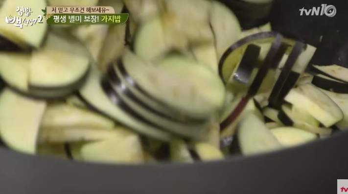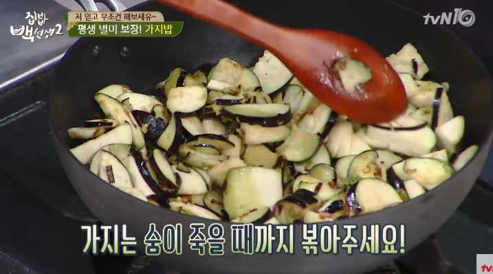 가지밥의 풍미를 살리는 과정으로, 재료를 볶는 방법이 중요합니다.
