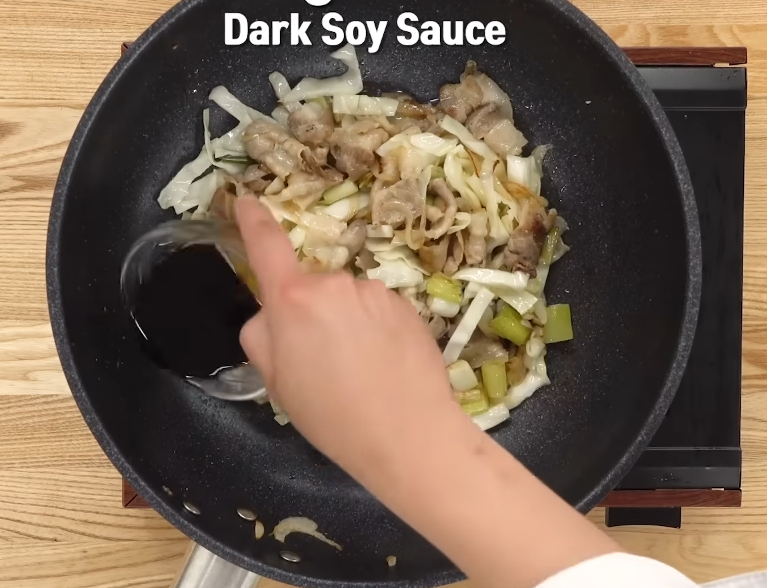 양배추를 추가하고 센 불에서 재빨리 볶아주세요. 이때 간장 한 큰술을 팬 가장자리에 돌려 넣으면 은은한 불 향이 입혀져 더욱 맛있어집니다.