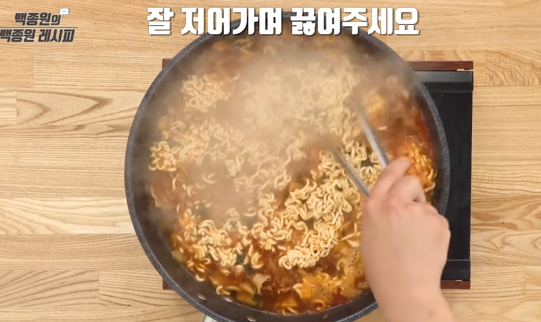 물이 끓기 시작하면 라면 스프를 넣고 잘 저어 녹입니다. 이때 불을 중불로 유지해 국물이 한층 진해지도록 끓입니다.