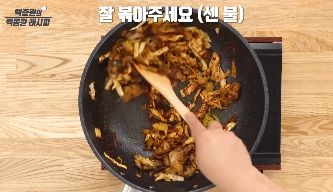 - 볶는 과정에서 불을 약하게 하지 말고 강하게 유지해야 불 맛이 납니다.