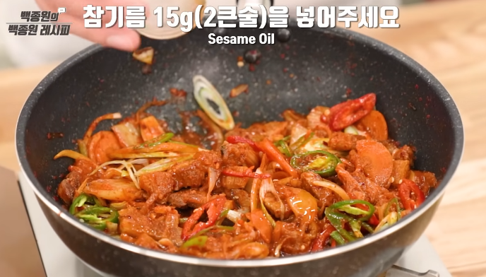 마지막으로 대파와 청양고추를 넣어 볶아 마무리합니다. 고소한 참기름 1스푼을 둘러주면 풍미가 한층 살아나며, 먹음직스러운 백종원 두부김치가 완성됩니다.