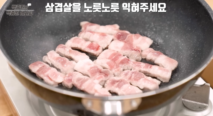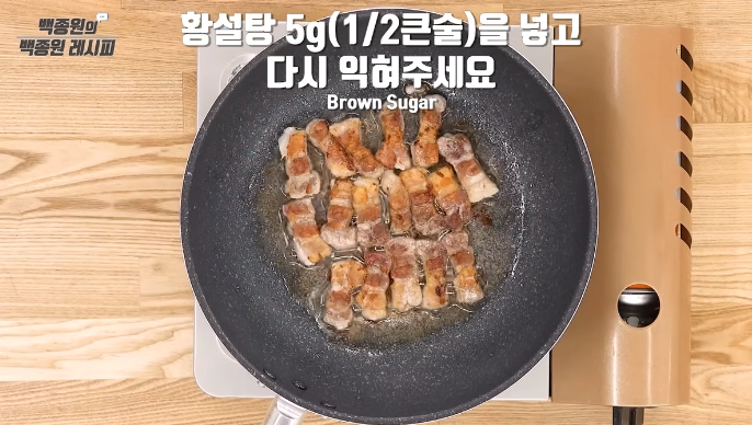 달군 팬에 삼겹살을 올려 노릇노릇하게 구워줍니다. 기름이 충분히 나오면 설탕 1스푼을 넣어 달큰한 풍미를 더해 주세요. 삼겹살을 구울 때는 중불로 천천히 익히는 것이 포인트입니다.