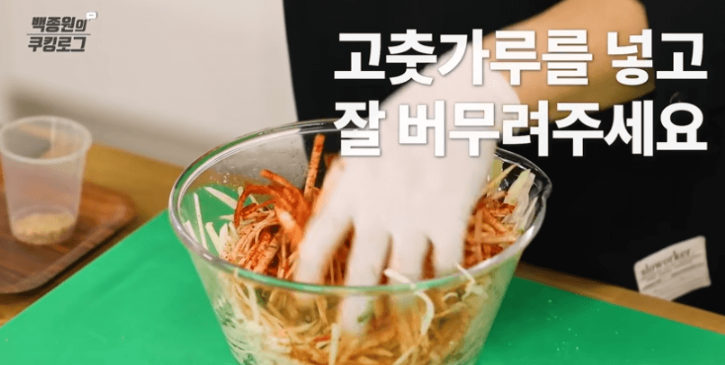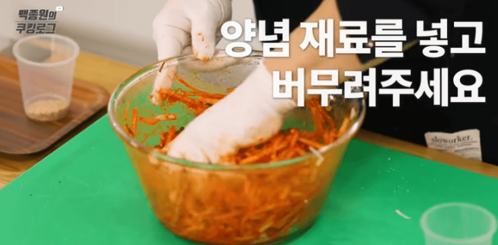 4. 손으로 조물조물 버무리면서 양념이 무에 잘 배이도록 해주세요. 이때 무의 아삭한 식감을 살리기 위해 너무 오래 치대지 않는 것이 중요합니다.