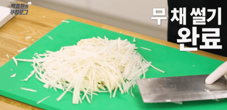 1. 먼저 무를 깨끗이 세척한 후 껍질을 제거하고 얇고 길게 채 썰어줍니다. 채 써는 굵기에 따라 식감이 달라지므로 너무 굵지 않게 써는 것이 좋습니다.