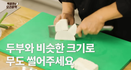 - 두부와 무: 같은 크기(3cm × 3cm)와 두께(0.7cm)로 썰어 통일감 있게 준비합니다.