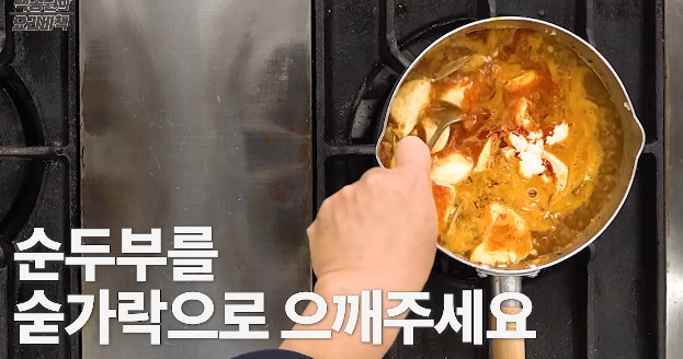 고기와 양념이 잘 어우러졌다면, 부드러운 순두부를 조심스럽게 넣어줍니다. 이때 숟가락으로 너무 세게 저으면 순두부가 쉽게 부서지므로, 국물과 순두부가 자연스럽게 섞이도록 살살 저어주는 것이 포인트입니다. 물을 적당히 부은 후 중불에서 끓이며, 국물 맛을 보고 간장이 부족하다면 조금씩 추가해가며 맞추면 좋습니다.