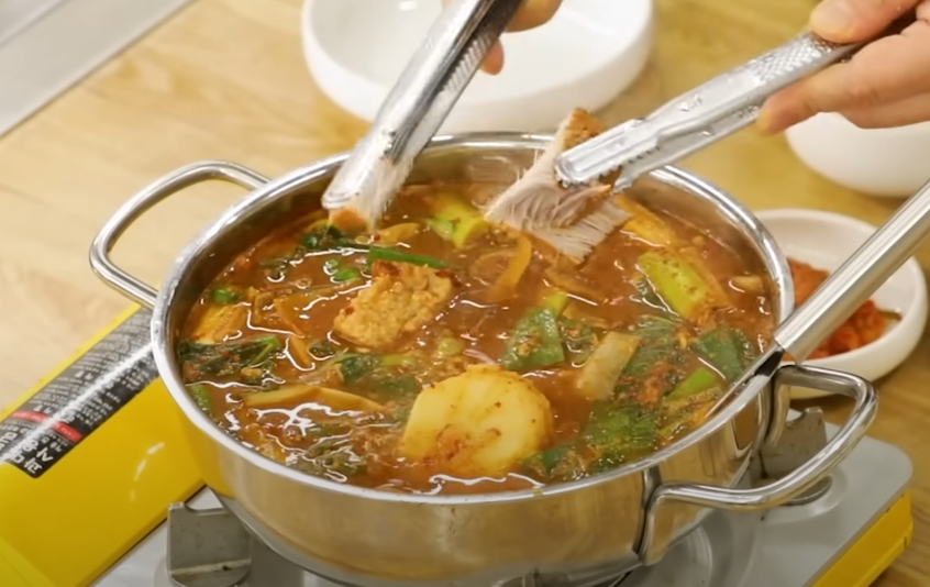 백종원 시래기감자탕의 첫 단계는 돼지 등뼈의 철저한 손질입니다. 찬물에 30분에서 1시간 정도 담가 핏물을 제거하고, 끓는 물에 소주나 월계수 잎을 함께 넣고 한 번 데쳐 줍니다. 이후 흐르는 찬물에 깨끗하게 씻어 불순물을 완전히 제거해야 국물이 탁하지 않고 깔끔해집니다.