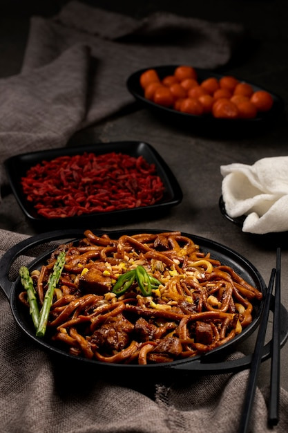 처음에 삶아 놓은 라면 사리를 팬에 넣고 양념과 재료들이 잘 어우러지도록 볶아줍니다. 마지막으로 어슷하게 썰어 놓은 대파를 넣고 재빨리 볶아주면, 파의 향긋함이 더해져 훨씬 먹음직스러운 볶음면이 완성됩니다. 너무 오래 볶지 않도록 주의하며, 불에서 내려 그릇에 담아주세요.