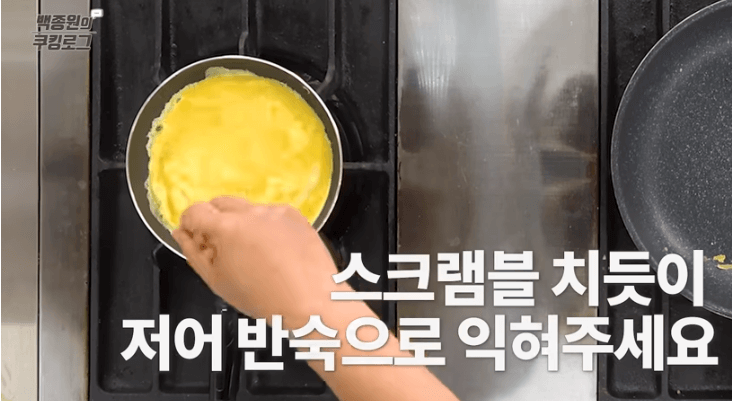 프라이팬에 식용유를 두른 후 예열된 상태에서 계란물을 붓고 약불에서 천천히 익힙니다. 젓지 말고 그대로 익히면 표면은 부드럽고 속은 촉촉한 반숙 상태가 됩니다.
