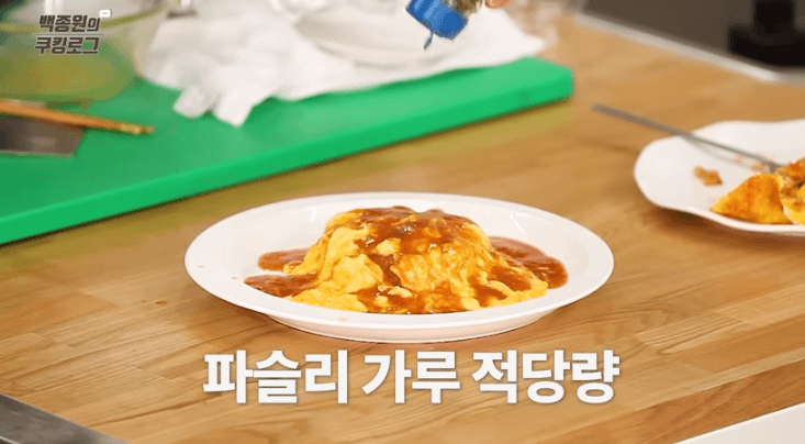 완성된 계란을 볶음밥 위에 올려 덮어주면, 백종원 오므라이스 완성입니다. 원한다면 위에 파슬리나 후추를 살짝 뿌려 데코해도 좋습니다.