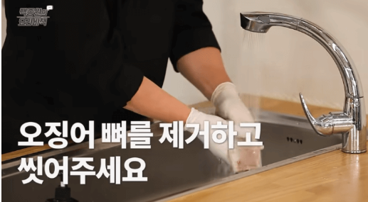 1. 오징어의 내장과 투명한 뼈를 제거한 뒤, 깨끗한 물로 여러 번 헹궈 비린 맛을 없앱니다.
