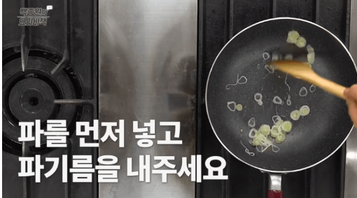 팬에 식용유를 두르고 대파를 송송 썰어 넣어 볶아줍니다. 파가 노릇해지며 향이 올라오면 파기름이 완성됩니다. 이 기름으로 볶으면 풍미가 훨씬 살아납니다.