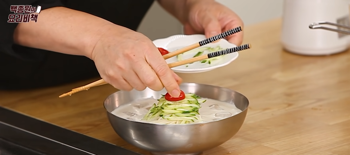 끓는 물에 국수를 넣고 포장지에 표시된 시간대로 삶습니다. 삶은 국수는 찬물에 여러 번 헹궈 전분을 제거하고 면발을 쫄깃하게 만듭니다. 얼음을 사용하면 더욱 시원한 식감이 살아납니다.