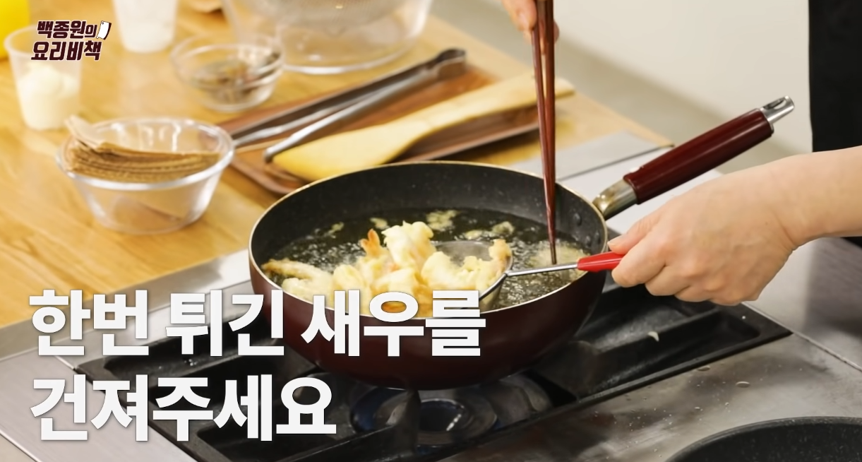 손질된 새우를 튀김 반죽에 넣고 전체적으로 골고루 묻힌 다음, 예열된 식용유에 튀깁니다. 적정 온도는 반죽을 한 방울 떨어뜨렸을 때 2~3초 후에 떠오를 때입니다. 새우를 넣고 약 3분간 튀기다가 노릇해지면 꺼내 기름을 빼줍니다. 더 바삭한 식감을 원하신다면 약 30초간 한 번 더 튀겨주시면 좋습니다.