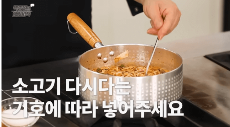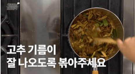 파기름이 완성되면, 준비한 소고기를 넣고 핏기가 사라질 때까지 볶습니다. 이후 고춧가루를 넣어 고추기름이 잘 배어 나오도록 중약불에서 골고루 섞어가며 볶아줍니다. 백종원 20분 육개장의 매콤함과 풍미는 이 단계에서 결정됩니다.