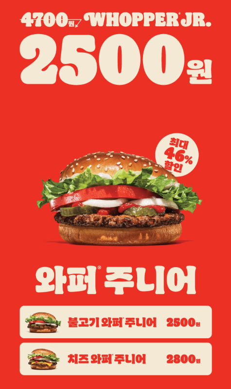 와퍼주니어와 불고기 와퍼주니어는 각각 2,500원, 치즈 와퍼주니어는 2,800원에 제공되며, 행사 기간은 2024년 12월 2일부터 12월 25일까지입니다.