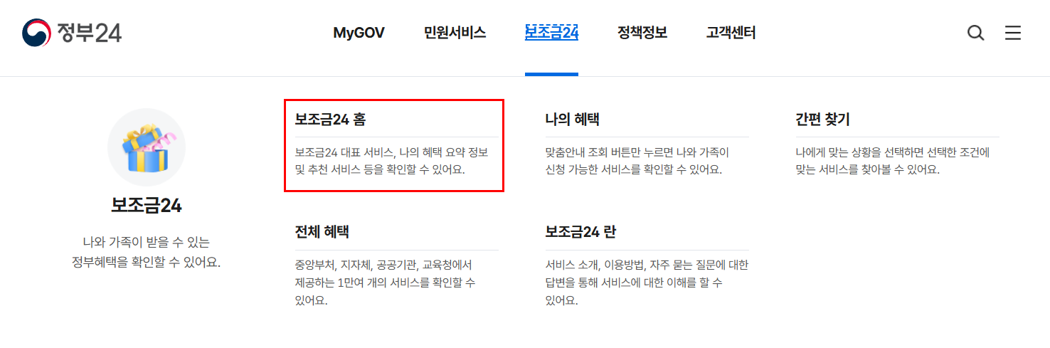 - 보조금24 선택: 메인 화면에서 '보조금24' 클릭