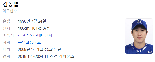 삼성 라이온즈에서 활약하며 2020년 홈런 20개를 기록하는 등 잠재력을 보였으나, 이번 시즌에는 기대에 미치지 못한 성적으로 방출 명단에 포함되었습니다. 김동엽의 통산 기록은 타율 0.268, 홈런 92개, 타점 316개로 마무리되었습니다.
