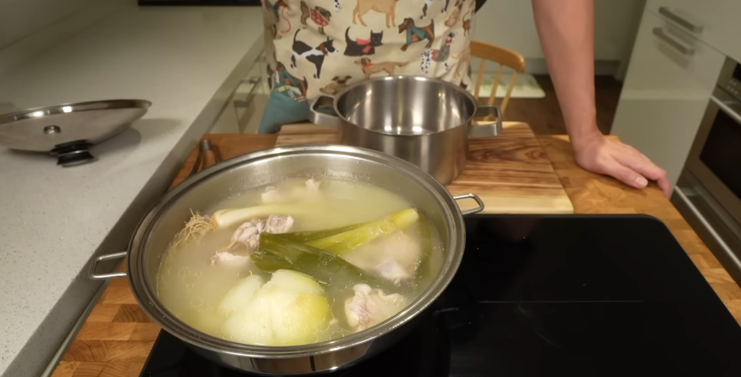 닭을 데친 후, 큰 냄비에 찬물을 다시 담고 손질한 닭을 넣습니다. 여기에 양파, 대파, 마늘을 통째로 넣고, 한방 팩이 있다면 함께 넣어줍니다. 뚜껑을 덮고 센 불에서 끓이다가 끓기 시작하면 중불로 줄여 약 40~50분간 천천히 끓입니다. 오랜 시간 우려낸 닭육수는 성시경 닭곰탕만의 진하고 구수한 풍미를 만들어줍니다.