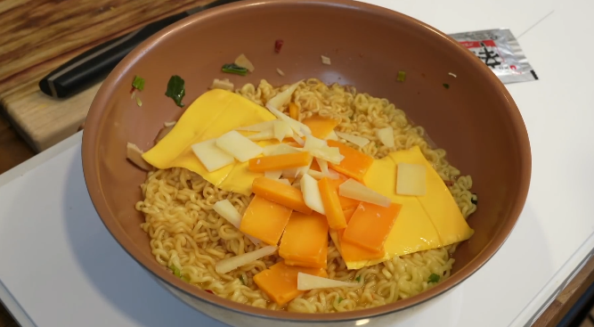 면이 거의 다 익었을 때쯤, 분말스프 한 봉지를 넣고 고루 저어줍니다. 분말스프는 두 개 중 한 개만 넣는 것이 포인트인데, 치즈의 풍미를 해치지 않으면서 매콤함을 살리는 비율이기 때문입니다. 이후 체다 치즈 두 장과 잘게 찢은 모짜렐라 치즈 50g을 라면 위에 고루 올려줍니다. 치즈는 면의 열기로 자연스럽게 녹으며 국물과 조화를 이룹니다.