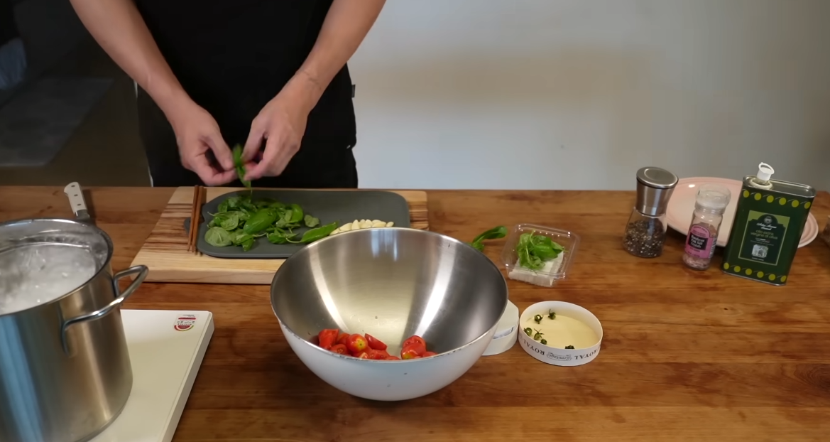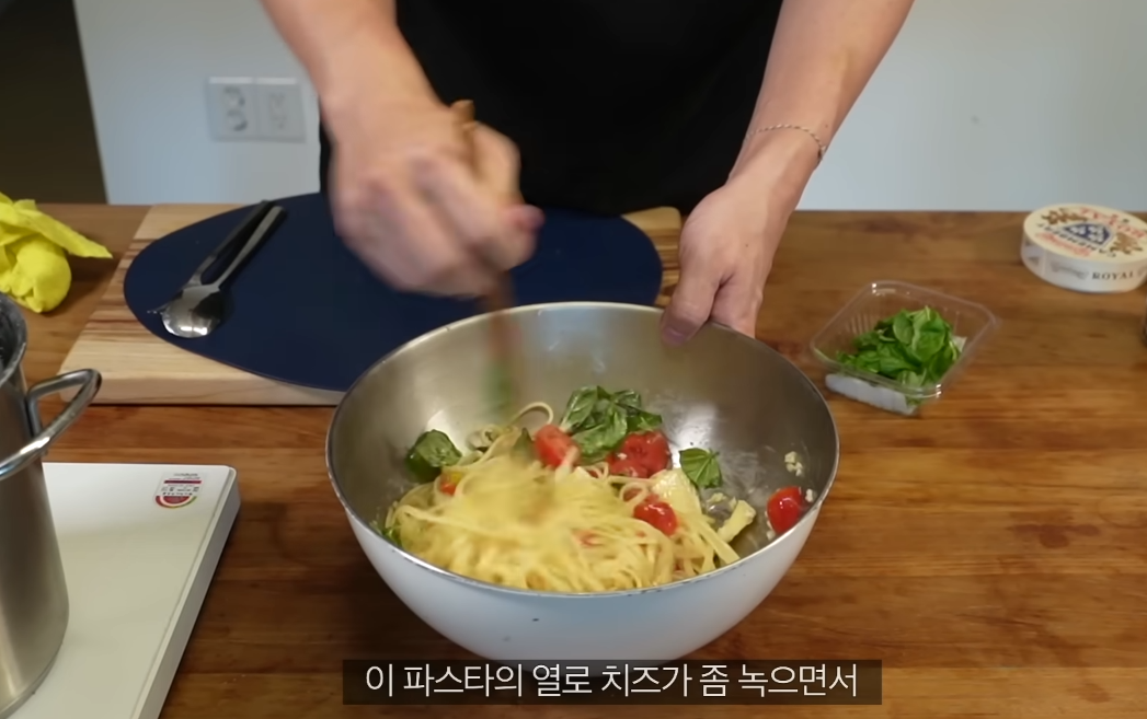 큰 볼에 방울토마토, 손질한 바질, 브리치즈를 넣고 소금과 후추로 기본 간을 합니다. 여기에 올리브오일을 넉넉히 둘러 풍미를 더하고, 다진 마늘을 넣어 전체적으로 섞어줍니다. 마지막으로 뜨거운 파스타면을 넣고 고루 버무려주면, 브리치즈가 서서히 녹으며 크리미한 소스를 형성합니다.