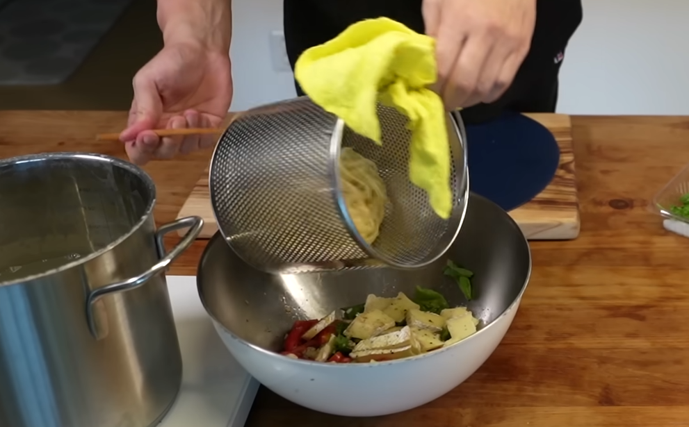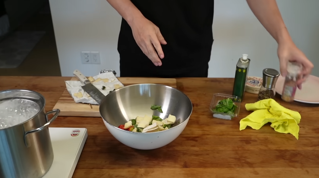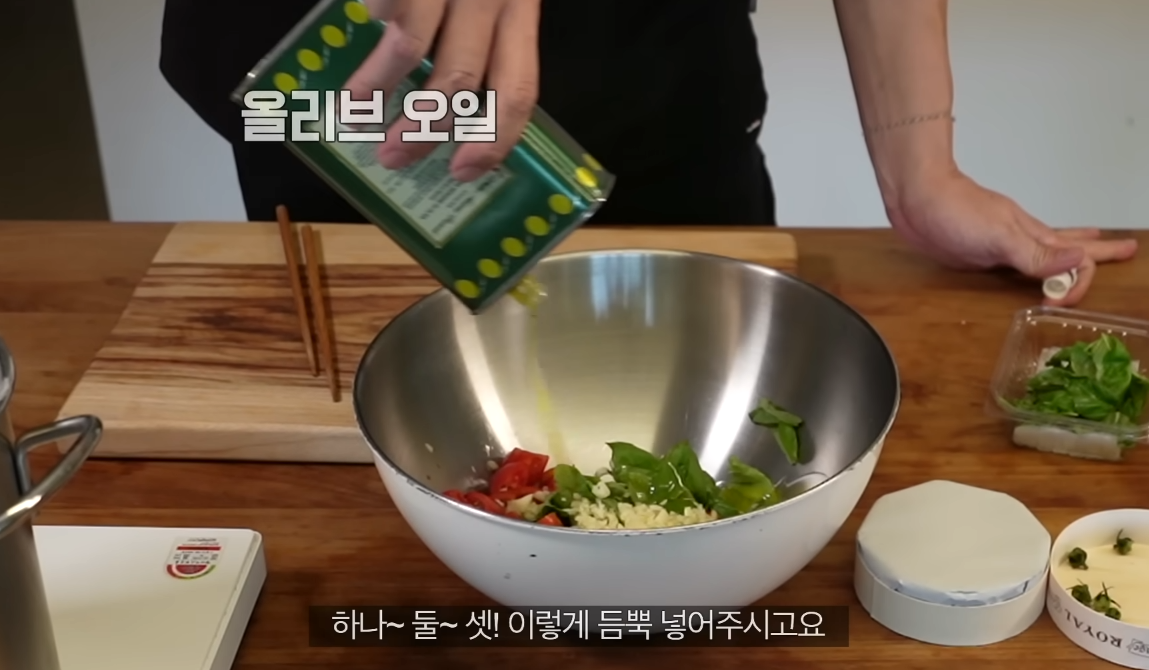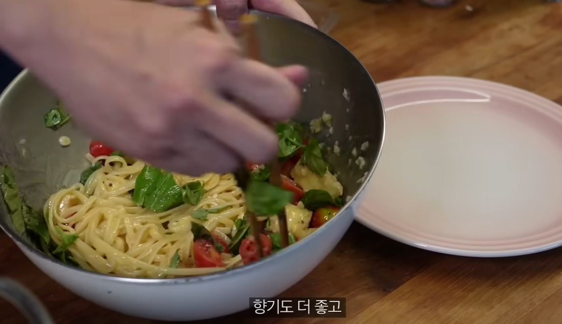 큰 볼에 방울토마토, 손질한 바질, 브리치즈를 넣고 소금과 후추로 기본 간을 합니다. 여기에 올리브오일을 넉넉히 둘러 풍미를 더하고, 다진 마늘을 넣어 전체적으로 섞어줍니다. 마지막으로 뜨거운 파스타면을 넣고 고루 버무려주면, 브리치즈가 서서히 녹으며 크리미한 소스를 형성합니다.