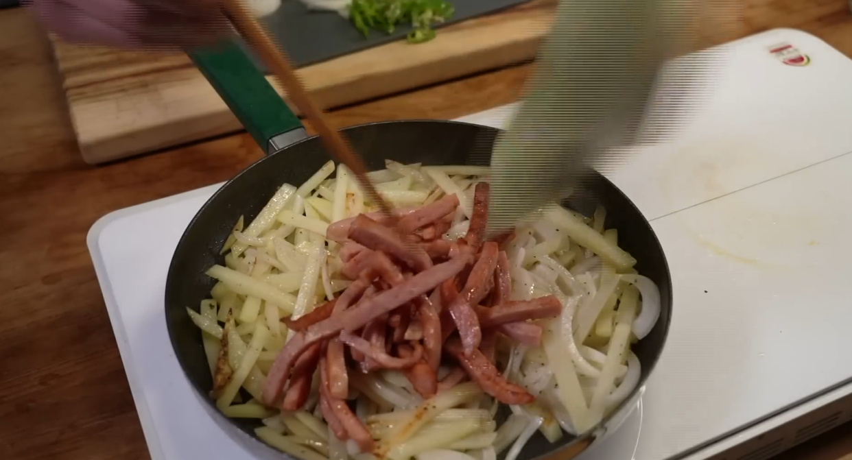 미리 볶아둔 스팸을 다시 팬에 넣고 전체적으로 잘 섞이도록 가볍게 볶아줍니다. 이때 감자와 스팸이 서로 어우러지도록 섞어주는 것이 포인트입니다.