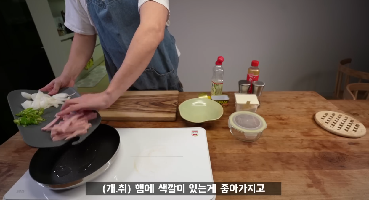 달궈진 팬에 스팸을 먼저 볶아 기름을 살짝 내줍니다. 약불에서 천천히 볶아 스팸이 노릇노릇해지도록 해 주세요. 이렇게 볶은 스팸은 팬에서 잠시 꺼내 따로 둡니다.