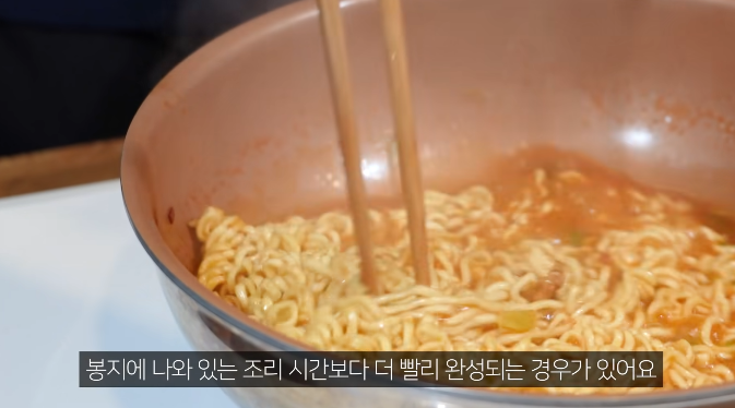 신라면이 어느 정도 퍼지기 시작하는 약 1분 후, 틈새라면 면과 스프를 추가로 넣어줍니다. 틈새라면은 매콤한 맛이 특징인 만큼 신라면과 조화롭게 어우러지도록 면을 골고루 저어주세요. 국물 색깔이 진해지고 맵고 고소한 향이 올라오기 시작하면 제대로 조리되고 있다는 신호입니다. 이후 약 2분 동안 강불에서 계속 끓여주세요.