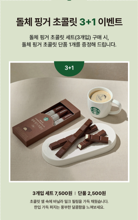 스타벅스는 수험생의 집중력을 돕기 위해 돌체 핑거 초콜릿(3개입) 구매 시 하나를 추가로 제공하는 '돌체 핑거 초콜릿 3+1' 이벤트를 운영합니다.
