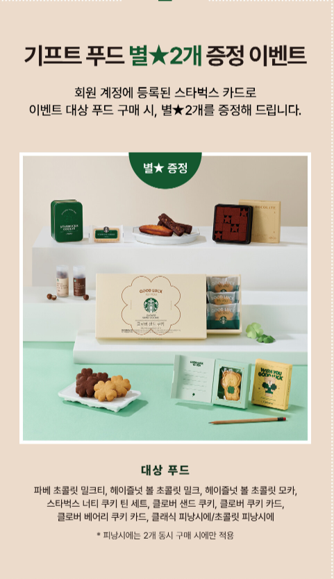 특정 스타벅스 카드로 지정된 제품을 구매할 경우 품목당 별 2개를 추가로 증정하는 혜택도 제공됩니다. 추가 별 증정 혜택이 적용되는 품목은 다음과 같습니다: